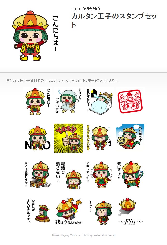 カルタン王子のLINEスタンプが発売されました! 2025 4/01 お知らせ カルタン王子関係 2025/04/01 本日より三池カルタ・歴史資料館のマスコットキャラクターである「カルタン王子」のLINEスタンプが発売されました! 下の画像をクリックすると販売ページに飛ぶことができます。 < 古い投稿2025年4月のイベントカレンダーができました 新しい投稿 >4人のカルタン王子のプロフィール紹介 お知らせ一覧へ戻る お知らせ カルタン王子関係