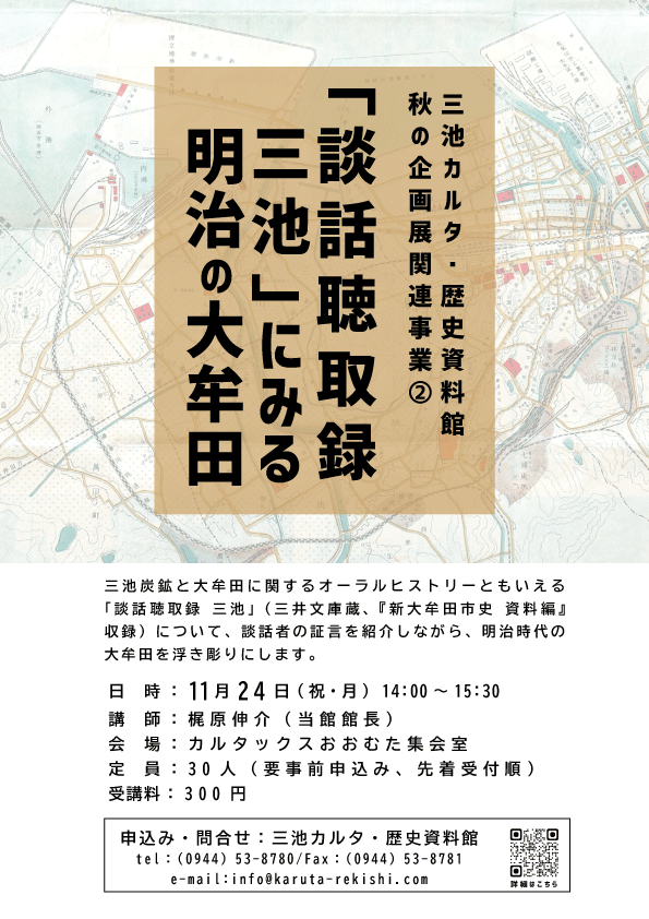 三池炭鉱と大牟田に関するオーラルヒストリーともいえる「談話聴取録 三池」(三井文庫蔵、『新大牟田市史 資料編』収録)について、談話者の証言を紹介しながら、明治時代の大牟田を浮き彫りにします。