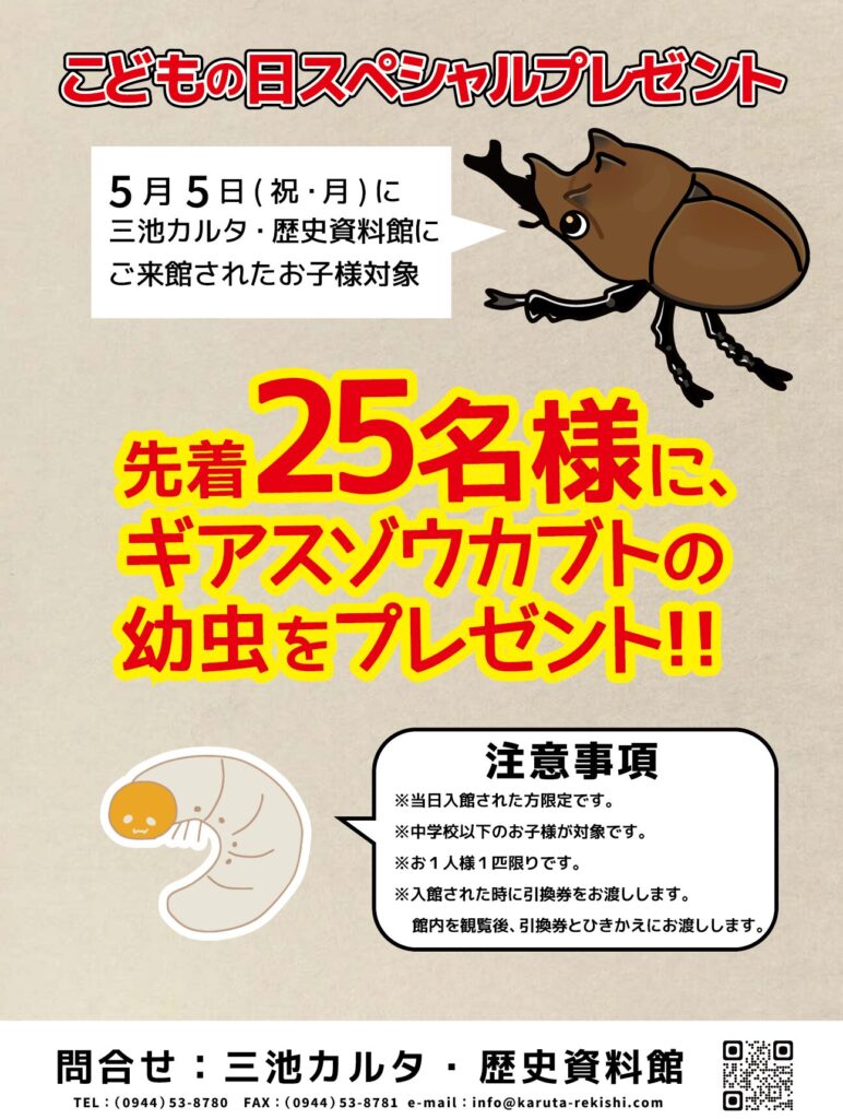 こどもの日はかぶとの日!ということで、2025年5月5日(祝・月)に入館された先着25名様まで「ギアスゾウカブトムシ」の幼虫をプレゼントします!