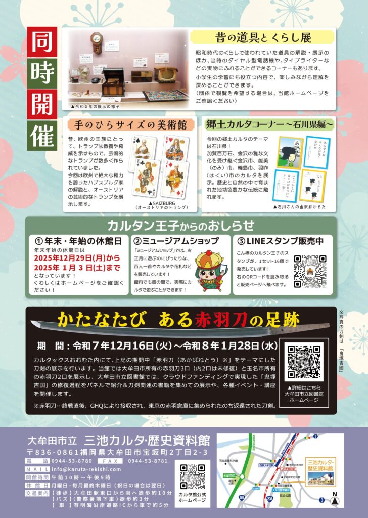 当館が令和6年度に収集したカルタの中から選りすぐりの約30点を公開します。また、昭和時代の生活用具を紹介する「昔の道具とくらし展」も同時開催します。